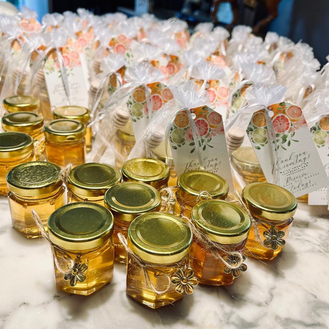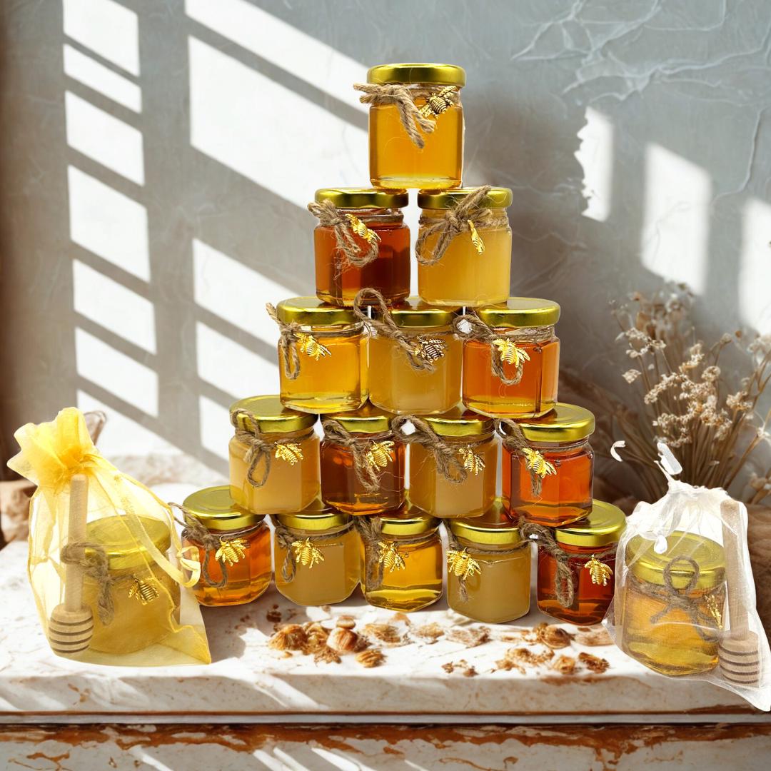 Make your event extra special with our beautifully packaged premium 2oz mini honey jars—a sweet and memorable favor for weddings, baby showers, bridal showers, and celebrations! Each jar is filled with pure, raw honey and comes wrapped in an individual bag with a charming bee charm and a wooden honey dipper.