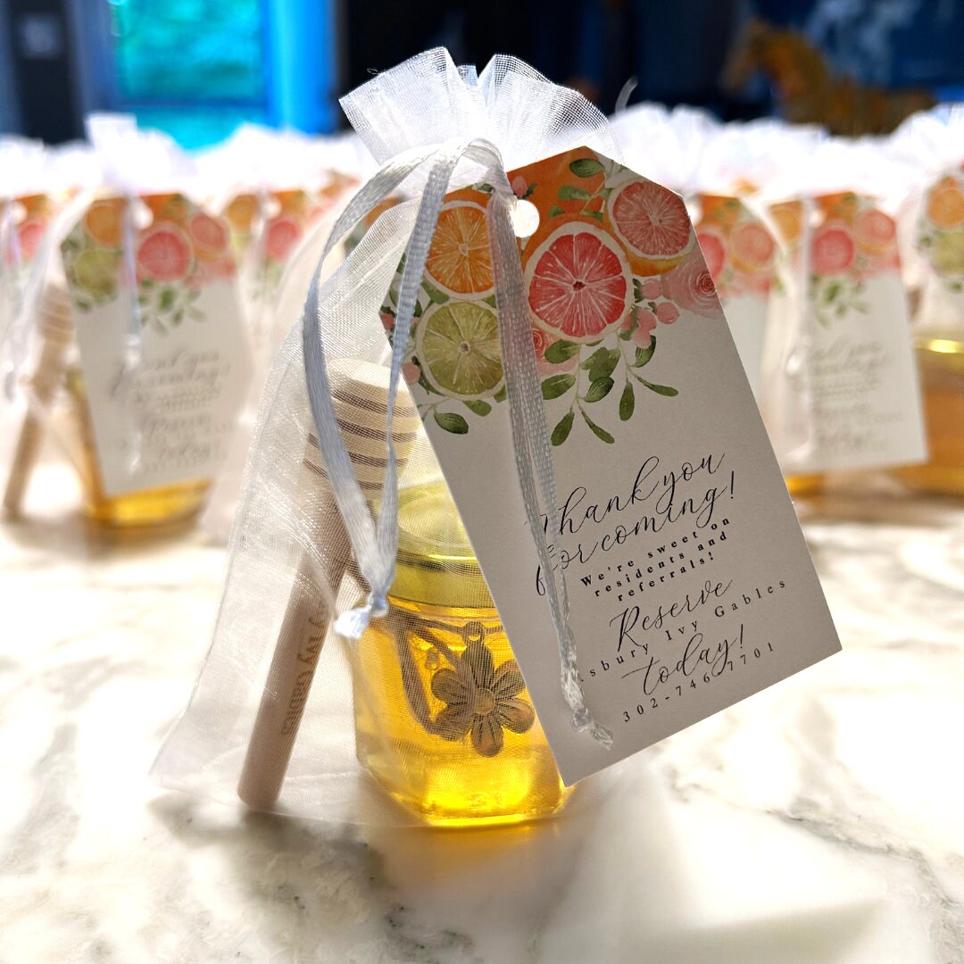 Make your favors even more special by personalizing the honey stick with a custom tag, name, date, or message. Additional fees apply. Contact us for pricing and details!