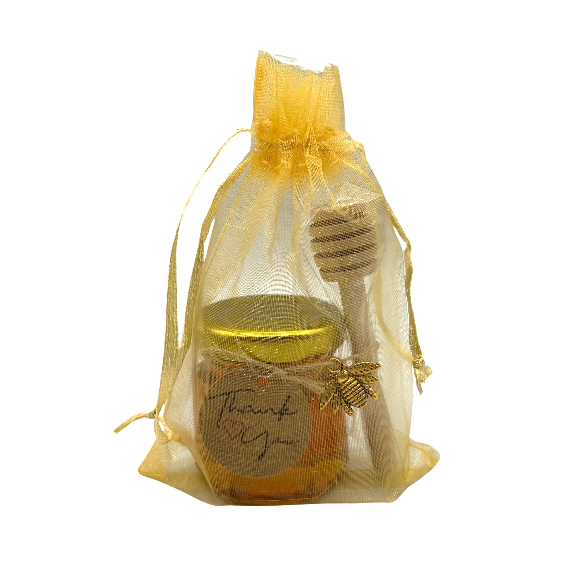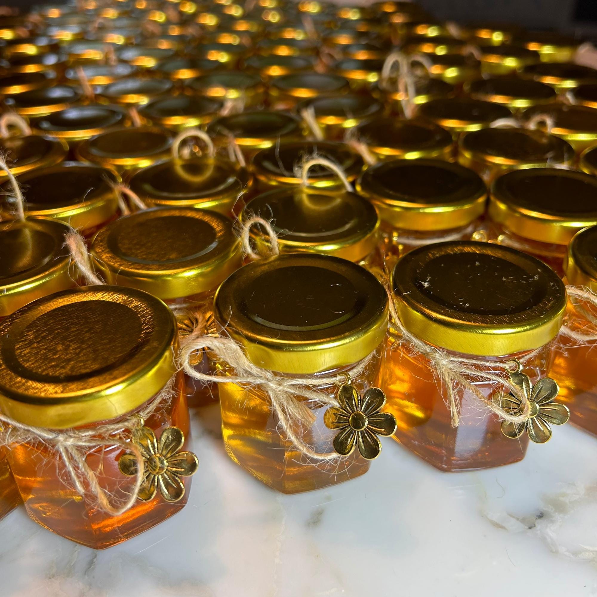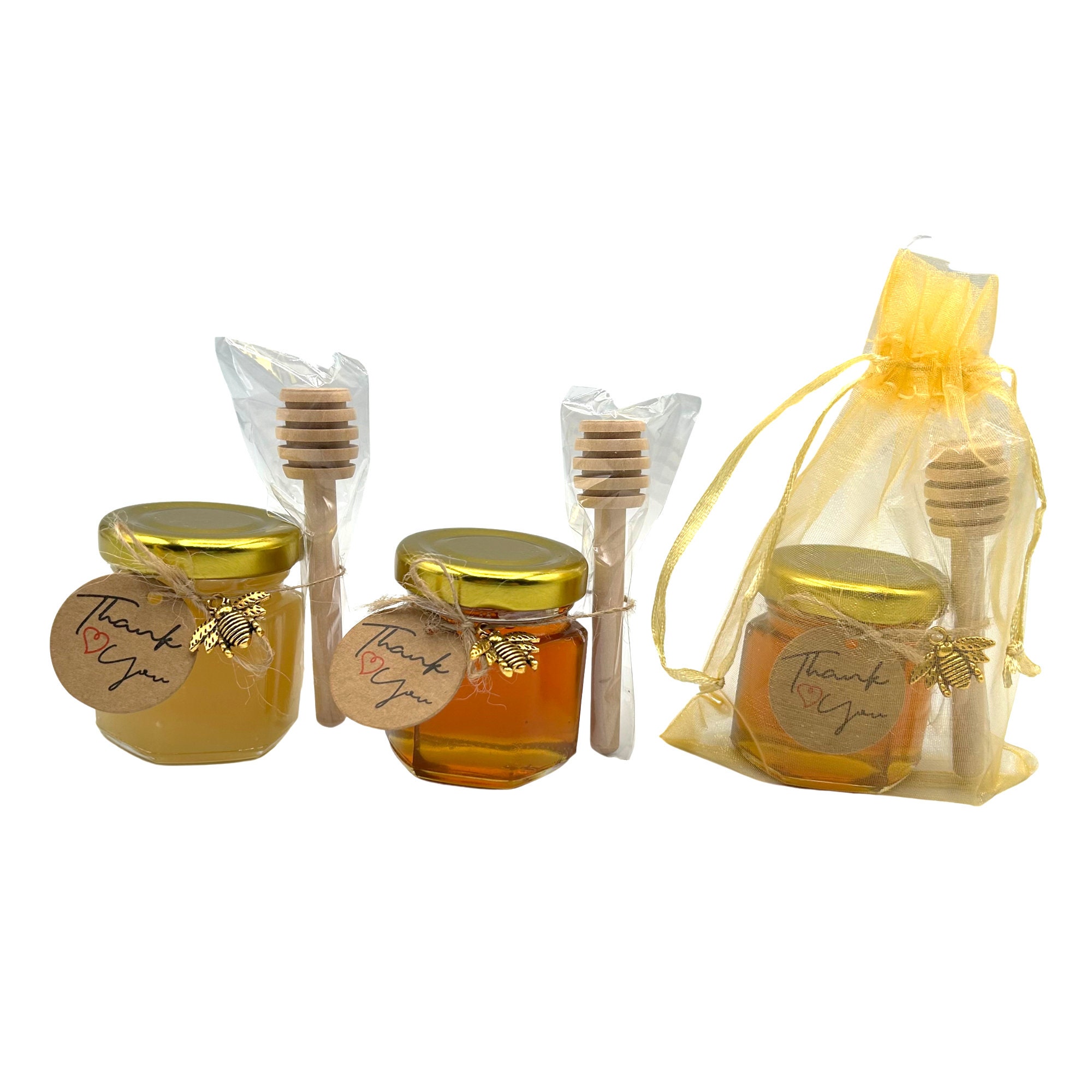 Make your event extra special with our beautifully packaged premium 2oz mini honey jars—a sweet and memorable favor for weddings, baby showers, bridal showers, and celebrations! Each jar is filled with pure, raw honey and comes wrapped in an individual bag with a charming bee charm and a wooden honey dipper.